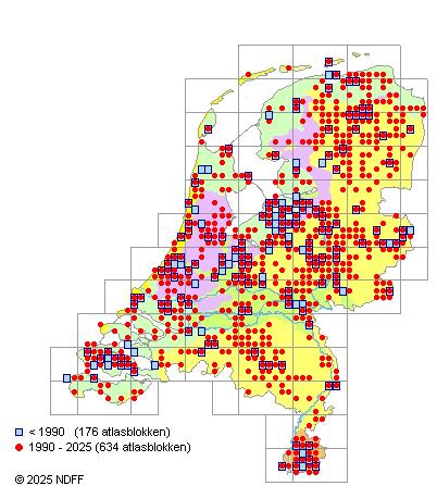 Het aantal atlasblokken (5x5 km) waarin de soort is gemeld binnen een periode van vijf jaar (vanaf 1980) of twintig jaar. Niet gecorrigeerd voor waarnemersinspanning en het aantal doorgegeven waarnemingen kan sterk variëren per periode, dus een trend in verspreiding kan hier niet direct uit worden afgelezen. Het opgegeven jaartal is het eerste jaar van de periode. Bron: gevalideerde waarnemingen uit de NDFF.