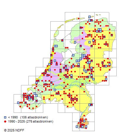 Het aantal atlasblokken (5x5 km) waarin de soort is gemeld binnen een periode van vijf jaar (vanaf 1980) of twintig jaar. Niet gecorrigeerd voor waarnemersinspanning en het aantal doorgegeven waarnemingen kan sterk variëren per periode, dus een trend in verspreiding kan hier niet direct uit worden afgelezen. Het opgegeven jaartal is het eerste jaar van de periode. Bron: gevalideerde waarnemingen uit de NDFF.