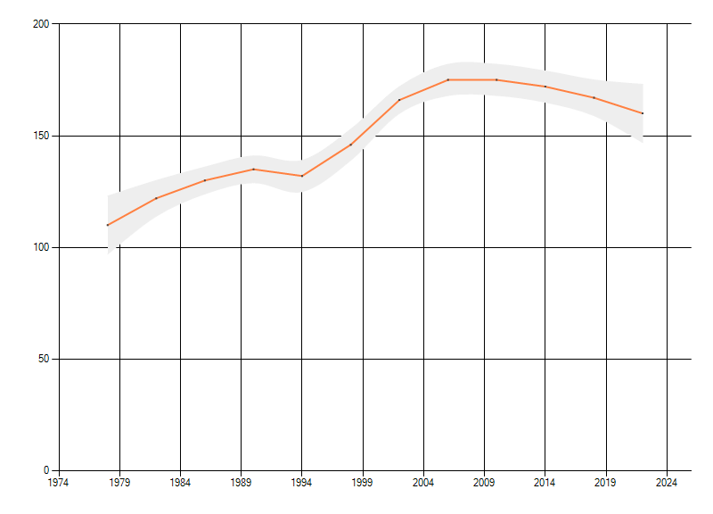 Gemiddelde trend van het aantal kilometerhokken waarin de soort voorkomt, weergegeven als indexcijfer (1975-1978 = 100).