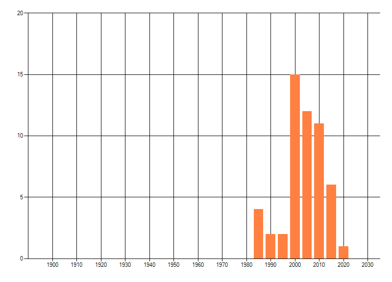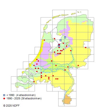 Het aantal atlasblokken (5x5 km) waarin de soort is gemeld binnen een periode van vijf jaar (vanaf 1980) of twintig jaar. Niet gecorrigeerd voor waarnemersinspanning en het aantal doorgegeven waarnemingen kan sterk variëren per periode, dus een trend in verspreiding kan hier niet direct uit worden afgelezen. Het opgegeven jaartal is het eerste jaar van de periode. Bron: gevalideerde waarnemingen uit de NDFF.