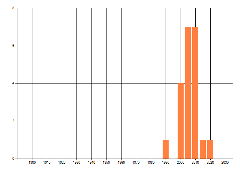 Het aantal atlasblokken (5x5 km) waarin de soort is gemeld binnen een periode van vijf jaar (vanaf 1980) of twintig jaar. Niet gecorrigeerd voor waarnemersinspanning en het aantal doorgegeven waarnemingen kan sterk variëren per periode, dus een trend in verspreiding kan hier niet direct uit worden afgelezen. Het opgegeven jaartal is het eerste jaar van de periode. Bron: gevalideerde waarnemingen uit de NDFF.