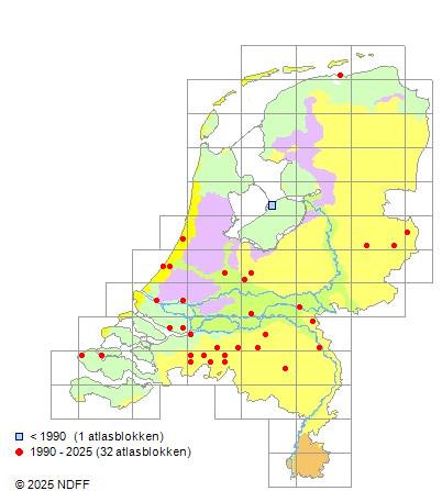 Het aantal atlasblokken (5x5 km) waarin de soort is gemeld binnen een periode van vijf jaar (vanaf 1980) of twintig jaar. Niet gecorrigeerd voor waarnemersinspanning en het aantal doorgegeven waarnemingen kan sterk variëren per periode, dus een trend in verspreiding kan hier niet direct uit worden afgelezen. Het opgegeven jaartal is het eerste jaar van de periode. Bron: gevalideerde waarnemingen uit de NDFF.