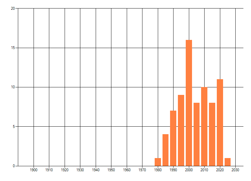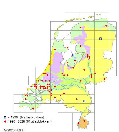 Het aantal atlasblokken (5x5 km) waarin de soort is gemeld binnen een periode van vijf jaar (vanaf 1980) of twintig jaar. Niet gecorrigeerd voor waarnemersinspanning en het aantal doorgegeven waarnemingen kan sterk variëren per periode, dus een trend in verspreiding kan hier niet direct uit worden afgelezen. Het opgegeven jaartal is het eerste jaar van de periode. Bron: gevalideerde waarnemingen uit de NDFF.