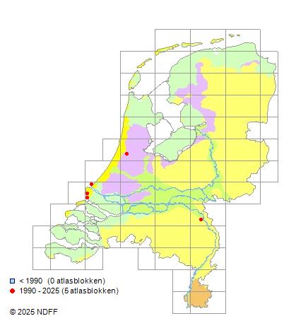Het aantal atlasblokken (5x5 km) waarin de soort is gemeld binnen een periode van vijf jaar (vanaf 1980) of twintig jaar. Niet gecorrigeerd voor waarnemersinspanning en het aantal doorgegeven waarnemingen kan sterk variëren per periode, dus een trend in verspreiding kan hier niet direct uit worden afgelezen. Het opgegeven jaartal is het eerste jaar van de periode. Bron: gevalideerde waarnemingen uit de NDFF.