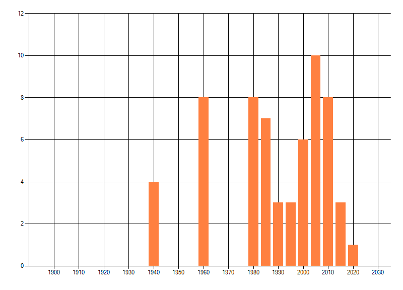 Het aantal atlasblokken (5x5 km) waarin de soort is gemeld binnen een periode van vijf jaar (vanaf 1980) of twintig jaar. Niet gecorrigeerd voor waarnemersinspanning en het aantal doorgegeven waarnemingen kan sterk variëren per periode, dus een trend in verspreiding kan hier niet direct uit worden afgelezen. Het opgegeven jaartal is het eerste jaar van de periode. Bron: gevalideerde waarnemingen uit de NDFF.