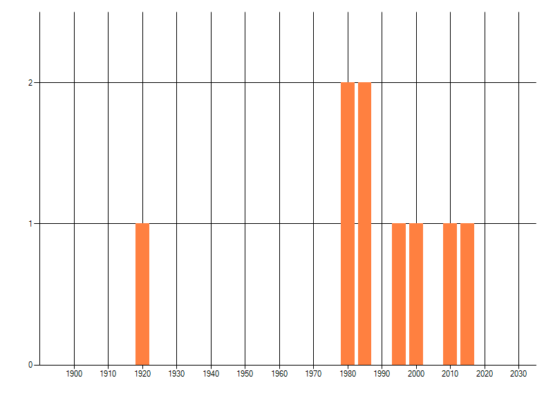 Het aantal atlasblokken (5x5 km) waarin de soort is gemeld binnen een periode van vijf jaar (vanaf 1980) of twintig jaar. Niet gecorrigeerd voor waarnemersinspanning en het aantal doorgegeven waarnemingen kan sterk variëren per periode, dus een trend in verspreiding kan hier niet direct uit worden afgelezen. Het opgegeven jaartal is het eerste jaar van de periode. Bron: gevalideerde waarnemingen uit de NDFF.