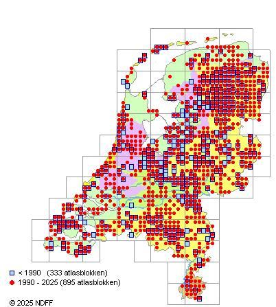 Het aantal atlasblokken (5x5 km) waarin de soort is gemeld binnen een periode van vijf jaar (vanaf 1980) of twintig jaar. Niet gecorrigeerd voor waarnemersinspanning en het aantal doorgegeven waarnemingen kan sterk variëren per periode, dus een trend in verspreiding kan hier niet direct uit worden afgelezen. Het opgegeven jaartal is het eerste jaar van de periode. Bron: gevalideerde waarnemingen uit de NDFF.