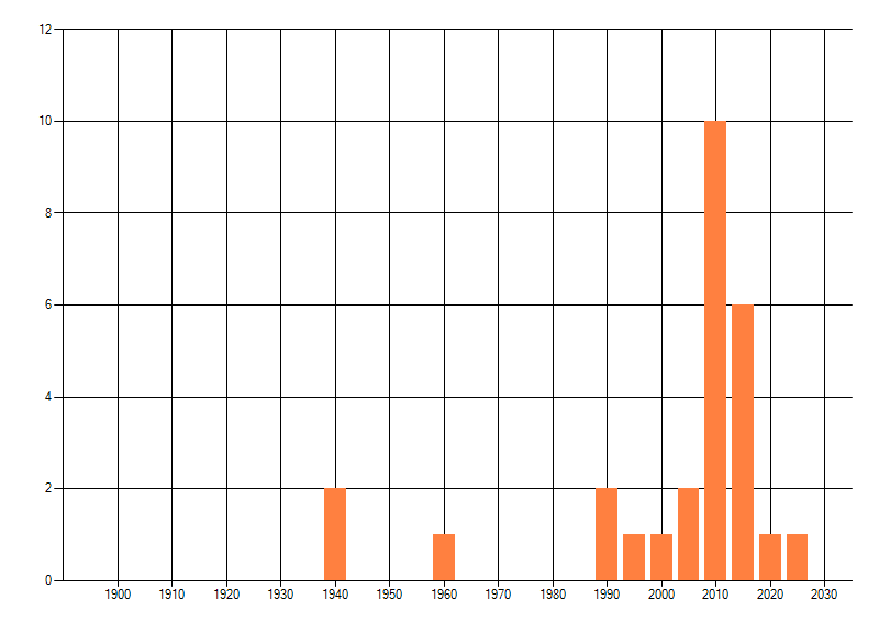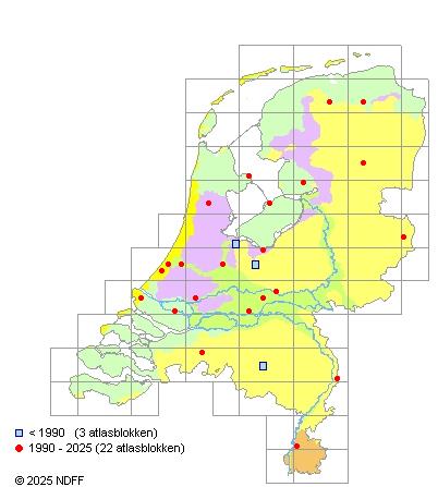 Het aantal atlasblokken (5x5 km) waarin de soort is gemeld binnen een periode van vijf jaar (vanaf 1980) of twintig jaar. Niet gecorrigeerd voor waarnemersinspanning en het aantal doorgegeven waarnemingen kan sterk variëren per periode, dus een trend in verspreiding kan hier niet direct uit worden afgelezen. Het opgegeven jaartal is het eerste jaar van de periode. Bron: gevalideerde waarnemingen uit de NDFF.