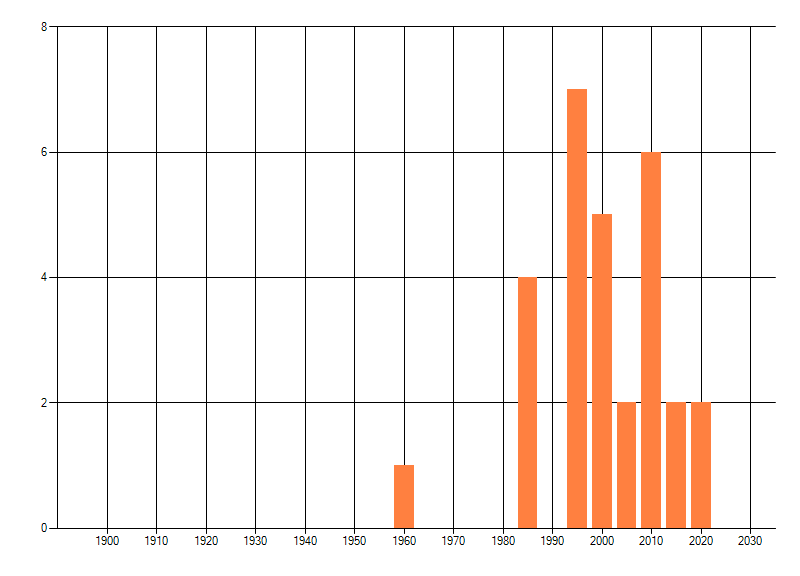 Het aantal atlasblokken (5x5 km) waarin de soort is gemeld binnen een periode van vijf jaar (vanaf 1980) of twintig jaar. Niet gecorrigeerd voor waarnemersinspanning en het aantal doorgegeven waarnemingen kan sterk variëren per periode, dus een trend in verspreiding kan hier niet direct uit worden afgelezen. Het opgegeven jaartal is het eerste jaar van de periode. Bron: gevalideerde waarnemingen uit de NDFF.