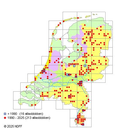 Het aantal atlasblokken (5x5 km) waarin de soort is gemeld binnen een periode van vijf jaar (vanaf 1980) of twintig jaar. Niet gecorrigeerd voor waarnemersinspanning en het aantal doorgegeven waarnemingen kan sterk variëren per periode, dus een trend in verspreiding kan hier niet direct uit worden afgelezen. Het opgegeven jaartal is het eerste jaar van de periode. Bron: gevalideerde waarnemingen uit de NDFF.