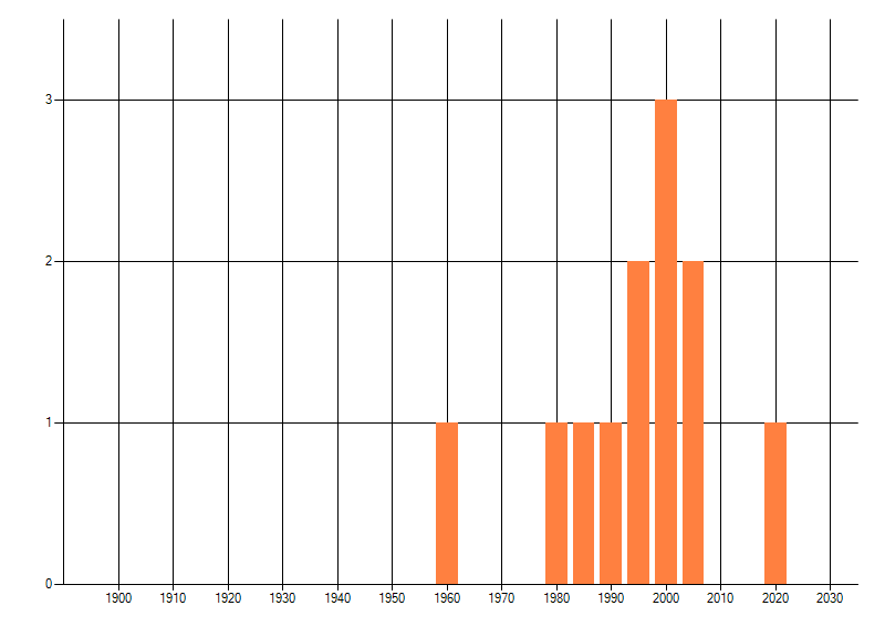 Het aantal atlasblokken (5x5 km) waarin de soort is gemeld binnen een periode van vijf jaar (vanaf 1980) of twintig jaar. Niet gecorrigeerd voor waarnemersinspanning en het aantal doorgegeven waarnemingen kan sterk variëren per periode, dus een trend in verspreiding kan hier niet direct uit worden afgelezen. Het opgegeven jaartal is het eerste jaar van de periode. Bron: gevalideerde waarnemingen uit de NDFF.