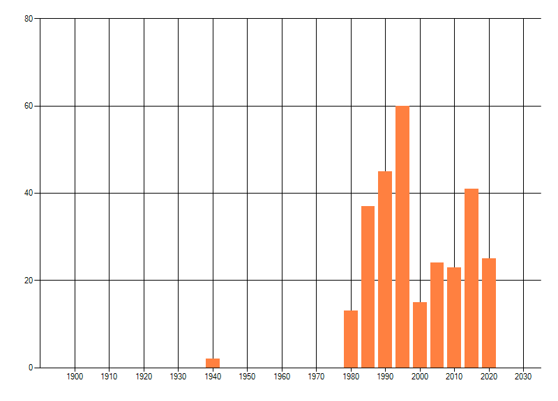 Het aantal atlasblokken (5x5 km) waarin de soort is gemeld binnen een periode van vijf jaar (vanaf 1980) of twintig jaar. Niet gecorrigeerd voor waarnemersinspanning en het aantal doorgegeven waarnemingen kan sterk variëren per periode, dus een trend in verspreiding kan hier niet direct uit worden afgelezen. Het opgegeven jaartal is het eerste jaar van de periode. Bron: gevalideerde waarnemingen uit de NDFF.