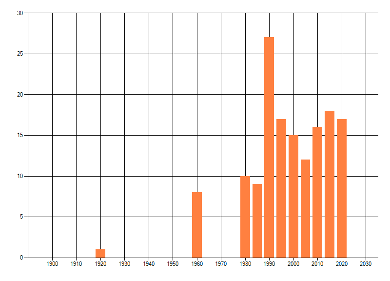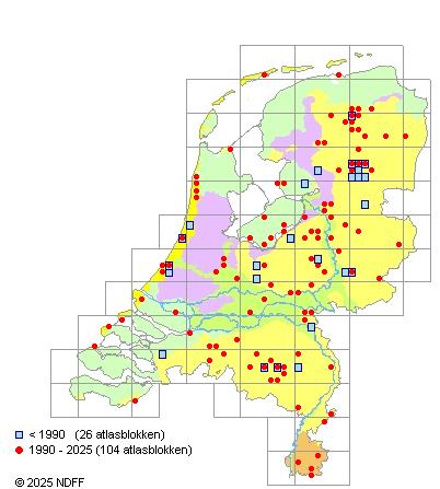 Het aantal atlasblokken (5x5 km) waarin de soort is gemeld binnen een periode van vijf jaar (vanaf 1980) of twintig jaar. Niet gecorrigeerd voor waarnemersinspanning en het aantal doorgegeven waarnemingen kan sterk variëren per periode, dus een trend in verspreiding kan hier niet direct uit worden afgelezen. Het opgegeven jaartal is het eerste jaar van de periode. Bron: gevalideerde waarnemingen uit de NDFF.
