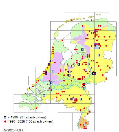 Het aantal atlasblokken (5x5 km) waarin de soort is gemeld binnen een periode van vijf jaar (vanaf 1980) of twintig jaar. Niet gecorrigeerd voor waarnemersinspanning en het aantal doorgegeven waarnemingen kan sterk variëren per periode, dus een trend in verspreiding kan hier niet direct uit worden afgelezen. Het opgegeven jaartal is het eerste jaar van de periode. Bron: gevalideerde waarnemingen uit de NDFF.