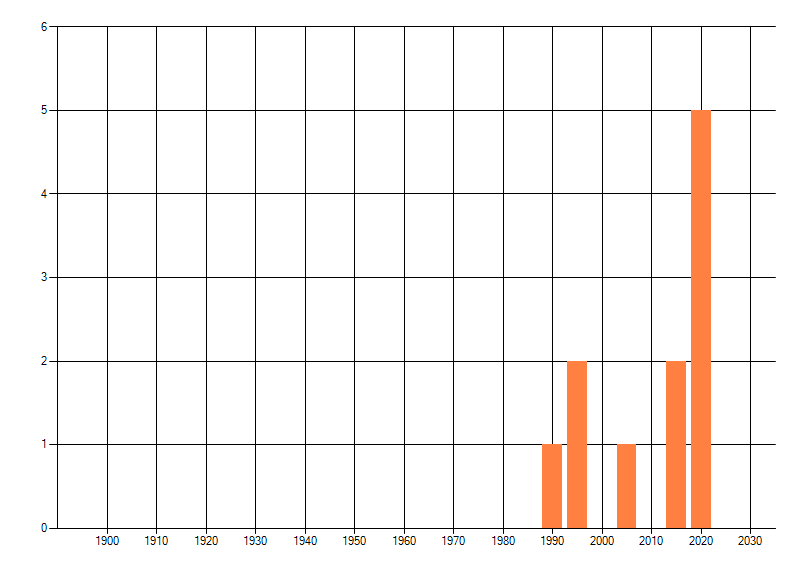 Het aantal atlasblokken (5x5 km) waarin de soort is gemeld binnen een periode van vijf jaar (vanaf 1980) of twintig jaar. Niet gecorrigeerd voor waarnemersinspanning en het aantal doorgegeven waarnemingen kan sterk variëren per periode, dus een trend in verspreiding kan hier niet direct uit worden afgelezen. Het opgegeven jaartal is het eerste jaar van de periode. Bron: gevalideerde waarnemingen uit de NDFF.