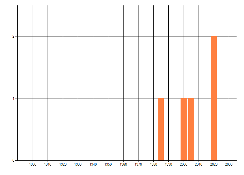 Het aantal atlasblokken (5x5 km) waarin de soort is gemeld binnen een periode van vijf jaar (vanaf 1980) of twintig jaar. Niet gecorrigeerd voor waarnemersinspanning en het aantal doorgegeven waarnemingen kan sterk variëren per periode, dus een trend in verspreiding kan hier niet direct uit worden afgelezen. Het opgegeven jaartal is het eerste jaar van de periode. Bron: gevalideerde waarnemingen uit de NDFF.