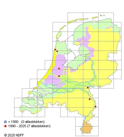 Het aantal atlasblokken (5x5 km) waarin de soort is gemeld binnen een periode van vijf jaar (vanaf 1980) of twintig jaar. Niet gecorrigeerd voor waarnemersinspanning en het aantal doorgegeven waarnemingen kan sterk variëren per periode, dus een trend in verspreiding kan hier niet direct uit worden afgelezen. Het opgegeven jaartal is het eerste jaar van de periode. Bron: gevalideerde waarnemingen uit de NDFF.