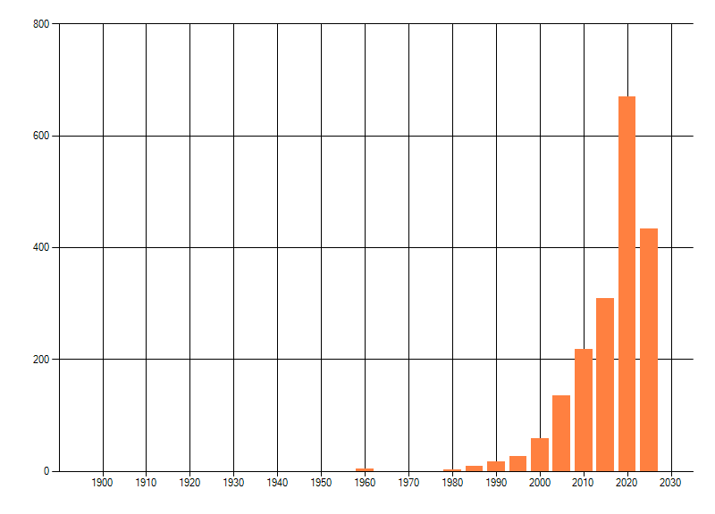 Het aantal atlasblokken (5x5 km) waarin de soort is gemeld binnen een periode van vijf jaar (vanaf 1980) of twintig jaar. Niet gecorrigeerd voor waarnemersinspanning en het aantal doorgegeven waarnemingen kan sterk variëren per periode, dus een trend in verspreiding kan hier niet direct uit worden afgelezen. Het opgegeven jaartal is het eerste jaar van de periode. Bron: gevalideerde waarnemingen uit de NDFF.