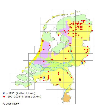 Het aantal atlasblokken (5x5 km) waarin de soort is gemeld binnen een periode van vijf jaar (vanaf 1980) of twintig jaar. Niet gecorrigeerd voor waarnemersinspanning en het aantal doorgegeven waarnemingen kan sterk variëren per periode, dus een trend in verspreiding kan hier niet direct uit worden afgelezen. Het opgegeven jaartal is het eerste jaar van de periode. Bron: gevalideerde waarnemingen uit de NDFF.
