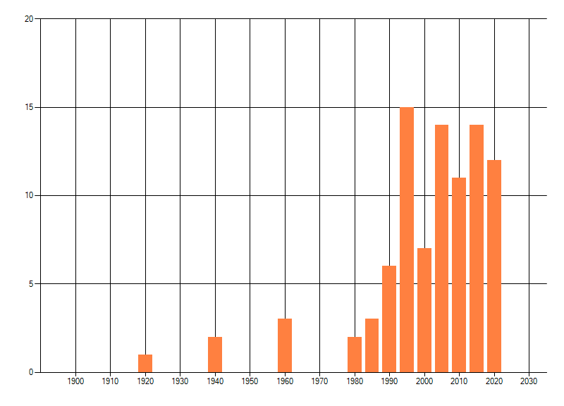 Het aantal atlasblokken (5x5 km) waarin de soort is gemeld binnen een periode van vijf jaar (vanaf 1980) of twintig jaar. Niet gecorrigeerd voor waarnemersinspanning en het aantal doorgegeven waarnemingen kan sterk variëren per periode, dus een trend in verspreiding kan hier niet direct uit worden afgelezen. Het opgegeven jaartal is het eerste jaar van de periode. Bron: gevalideerde waarnemingen uit de NDFF.