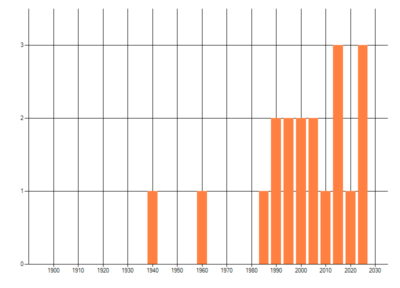 Het aantal atlasblokken (5x5 km) waarin de soort is gemeld binnen een periode van vijf jaar (vanaf 1980) of twintig jaar. Niet gecorrigeerd voor waarnemersinspanning en het aantal doorgegeven waarnemingen kan sterk variëren per periode, dus een trend in verspreiding kan hier niet direct uit worden afgelezen. Het opgegeven jaartal is het eerste jaar van de periode. Bron: gevalideerde waarnemingen uit de NDFF.