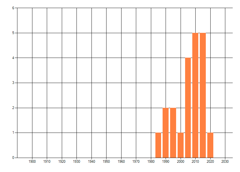 Het aantal atlasblokken (5x5 km) waarin de soort is gemeld binnen een periode van vijf jaar (vanaf 1980) of twintig jaar. Niet gecorrigeerd voor waarnemersinspanning en het aantal doorgegeven waarnemingen kan sterk variëren per periode, dus een trend in verspreiding kan hier niet direct uit worden afgelezen. Het opgegeven jaartal is het eerste jaar van de periode. Bron: gevalideerde waarnemingen uit de NDFF.