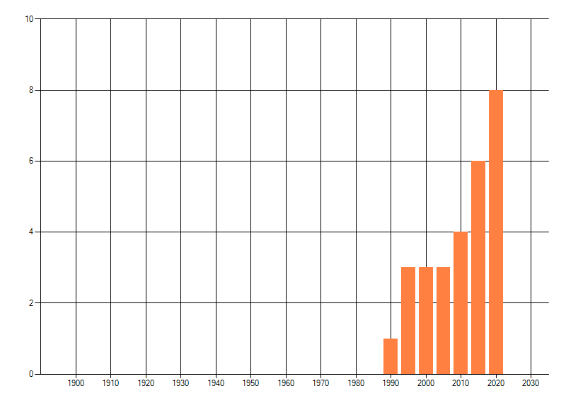 Het aantal atlasblokken (5x5 km) waarin de soort is gemeld binnen een periode van vijf jaar (vanaf 1980) of twintig jaar. Niet gecorrigeerd voor waarnemersinspanning en het aantal doorgegeven waarnemingen kan sterk variëren per periode, dus een trend in verspreiding kan hier niet direct uit worden afgelezen. Het opgegeven jaartal is het eerste jaar van de periode. Bron: gevalideerde waarnemingen uit de NDFF.