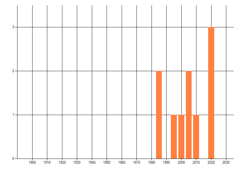 Het aantal atlasblokken (5x5 km) waarin de soort is gemeld binnen een periode van vijf jaar (vanaf 1980) of twintig jaar. Niet gecorrigeerd voor waarnemersinspanning en het aantal doorgegeven waarnemingen kan sterk variëren per periode, dus een trend in verspreiding kan hier niet direct uit worden afgelezen. Het opgegeven jaartal is het eerste jaar van de periode. Bron: gevalideerde waarnemingen uit de NDFF.