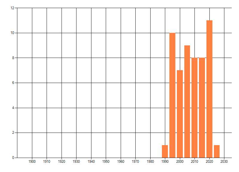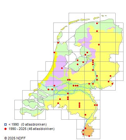 Het aantal atlasblokken (5x5 km) waarin de soort is gemeld binnen een periode van vijf jaar (vanaf 1980) of twintig jaar. Niet gecorrigeerd voor waarnemersinspanning en het aantal doorgegeven waarnemingen kan sterk variëren per periode, dus een trend in verspreiding kan hier niet direct uit worden afgelezen. Het opgegeven jaartal is het eerste jaar van de periode. Bron: gevalideerde waarnemingen uit de NDFF.