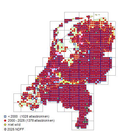 De trend is gecorrigeerd voor waarnemersinspanning en geeft de relatieve verandering in het aantal bezette kilometerhokken weer.