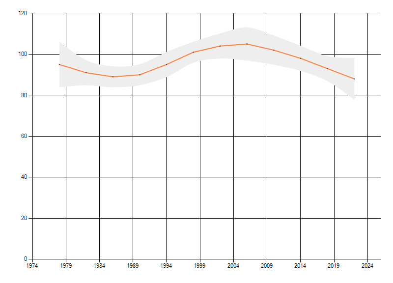 Gemiddelde trend van het aantal kilometerhokken waarin de soort voorkomt, weergegeven als indexcijfer (1975-1978 = 100).