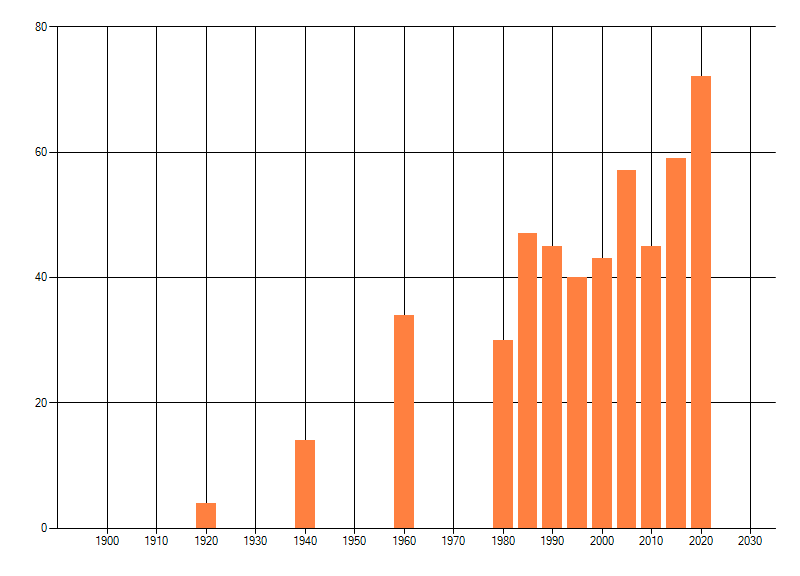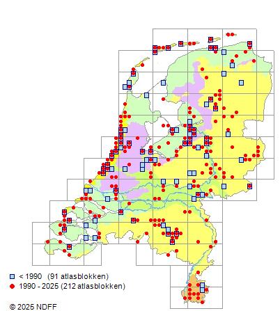 Het aantal atlasblokken (5x5 km) waarin de soort is gemeld binnen een periode van vijf jaar (vanaf 1980) of twintig jaar. Niet gecorrigeerd voor waarnemersinspanning en het aantal doorgegeven waarnemingen kan sterk variëren per periode, dus een trend in verspreiding kan hier niet direct uit worden afgelezen. Het opgegeven jaartal is het eerste jaar van de periode. Bron: gevalideerde waarnemingen uit de NDFF.