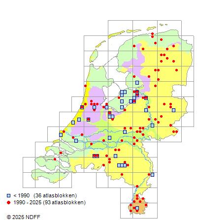 Het aantal atlasblokken (5x5 km) waarin de soort is gemeld binnen een periode van vijf jaar (vanaf 1980) of twintig jaar. Niet gecorrigeerd voor waarnemersinspanning en het aantal doorgegeven waarnemingen kan sterk variëren per periode, dus een trend in verspreiding kan hier niet direct uit worden afgelezen. Het opgegeven jaartal is het eerste jaar van de periode. Bron: gevalideerde waarnemingen uit de NDFF.