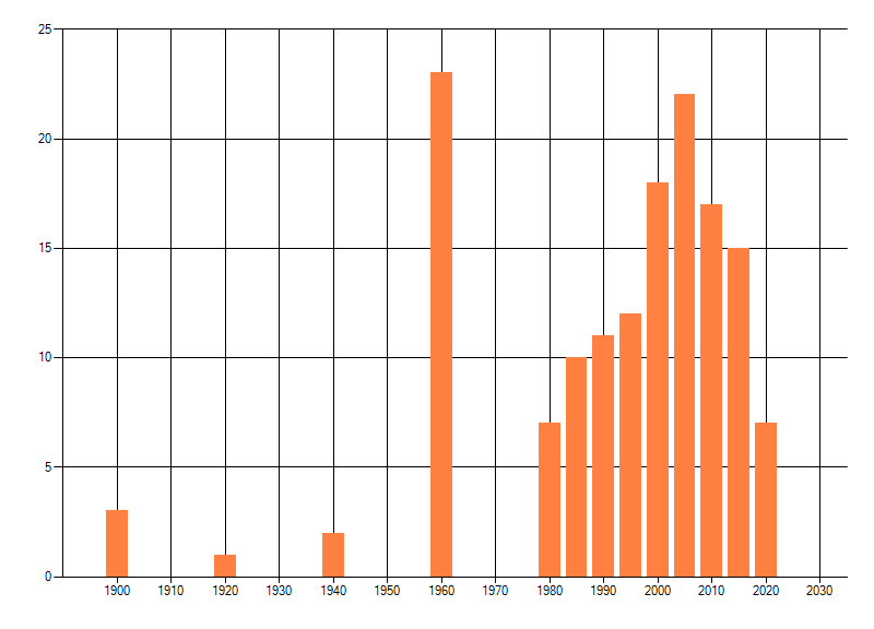 Het aantal atlasblokken (5x5 km) waarin de soort is gemeld binnen een periode van vijf jaar (vanaf 1980) of twintig jaar. Niet gecorrigeerd voor waarnemersinspanning en het aantal doorgegeven waarnemingen kan sterk variëren per periode, dus een trend in verspreiding kan hier niet direct uit worden afgelezen. Het opgegeven jaartal is het eerste jaar van de periode. Bron: gevalideerde waarnemingen uit de NDFF.