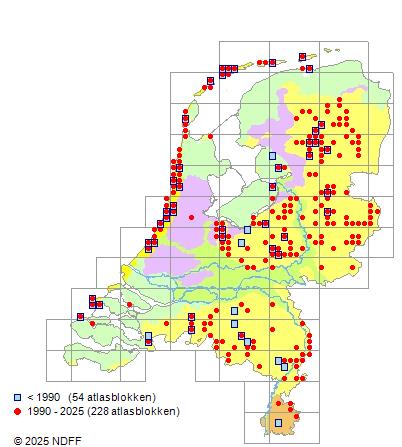 Het aantal atlasblokken (5x5 km) waarin de soort is gemeld binnen een periode van vijf jaar (vanaf 1980) of twintig jaar. Niet gecorrigeerd voor waarnemersinspanning en het aantal doorgegeven waarnemingen kan sterk variëren per periode, dus een trend in verspreiding kan hier niet direct uit worden afgelezen. Het opgegeven jaartal is het eerste jaar van de periode. Bron: gevalideerde waarnemingen uit de NDFF.