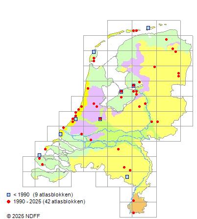 Het aantal atlasblokken (5x5 km) waarin de soort is gemeld binnen een periode van vijf jaar (vanaf 1980) of twintig jaar. Niet gecorrigeerd voor waarnemersinspanning en het aantal doorgegeven waarnemingen kan sterk variëren per periode, dus een trend in verspreiding kan hier niet direct uit worden afgelezen. Het opgegeven jaartal is het eerste jaar van de periode. Bron: gevalideerde waarnemingen uit de NDFF.