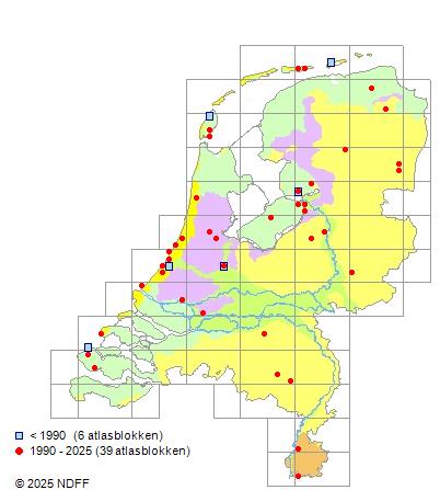 Het aantal atlasblokken (5x5 km) waarin de soort is gemeld binnen een periode van vijf jaar (vanaf 1980) of twintig jaar. Niet gecorrigeerd voor waarnemersinspanning en het aantal doorgegeven waarnemingen kan sterk variëren per periode, dus een trend in verspreiding kan hier niet direct uit worden afgelezen. Het opgegeven jaartal is het eerste jaar van de periode. Bron: gevalideerde waarnemingen uit de NDFF.