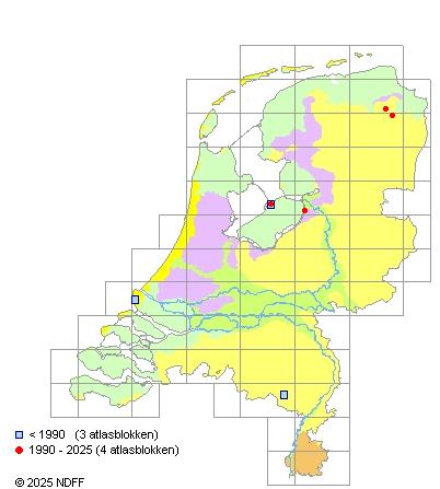 Het aantal atlasblokken (5x5 km) waarin de soort is gemeld binnen een periode van vijf jaar (vanaf 1980) of twintig jaar. Niet gecorrigeerd voor waarnemersinspanning en het aantal doorgegeven waarnemingen kan sterk variëren per periode, dus een trend in verspreiding kan hier niet direct uit worden afgelezen. Het opgegeven jaartal is het eerste jaar van de periode. Bron: gevalideerde waarnemingen uit de NDFF.
