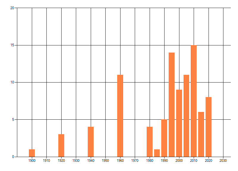 Het aantal atlasblokken (5x5 km) waarin de soort is gemeld binnen een periode van vijf jaar (vanaf 1980) of twintig jaar. Niet gecorrigeerd voor waarnemersinspanning en het aantal doorgegeven waarnemingen kan sterk variëren per periode, dus een trend in verspreiding kan hier niet direct uit worden afgelezen. Het opgegeven jaartal is het eerste jaar van de periode. Bron: gevalideerde waarnemingen uit de NDFF.