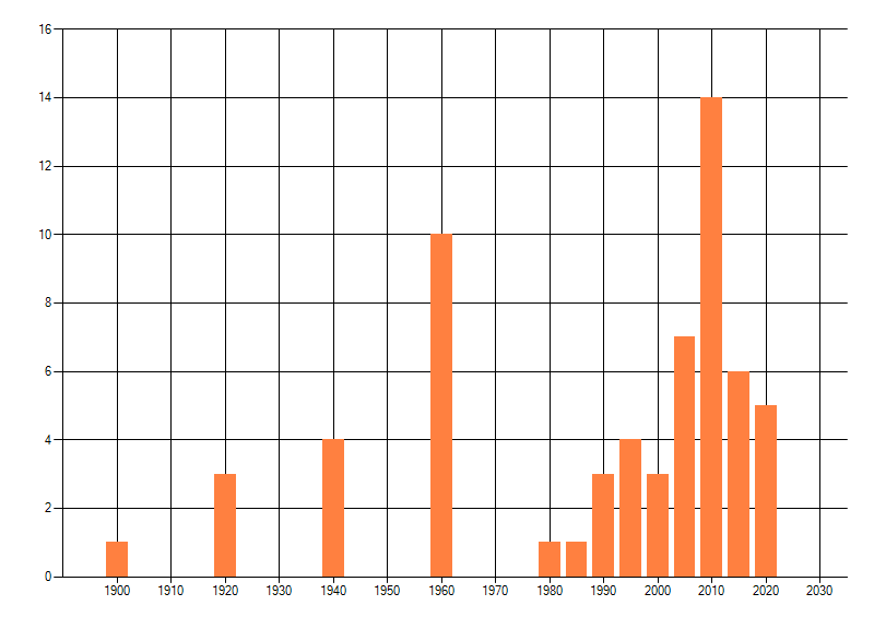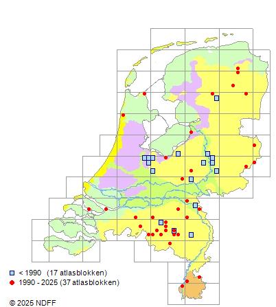 Het aantal atlasblokken (5x5 km) waarin de soort is gemeld binnen een periode van vijf jaar (vanaf 1980) of twintig jaar. Niet gecorrigeerd voor waarnemersinspanning en het aantal doorgegeven waarnemingen kan sterk variëren per periode, dus een trend in verspreiding kan hier niet direct uit worden afgelezen. Het opgegeven jaartal is het eerste jaar van de periode. Bron: gevalideerde waarnemingen uit de NDFF.