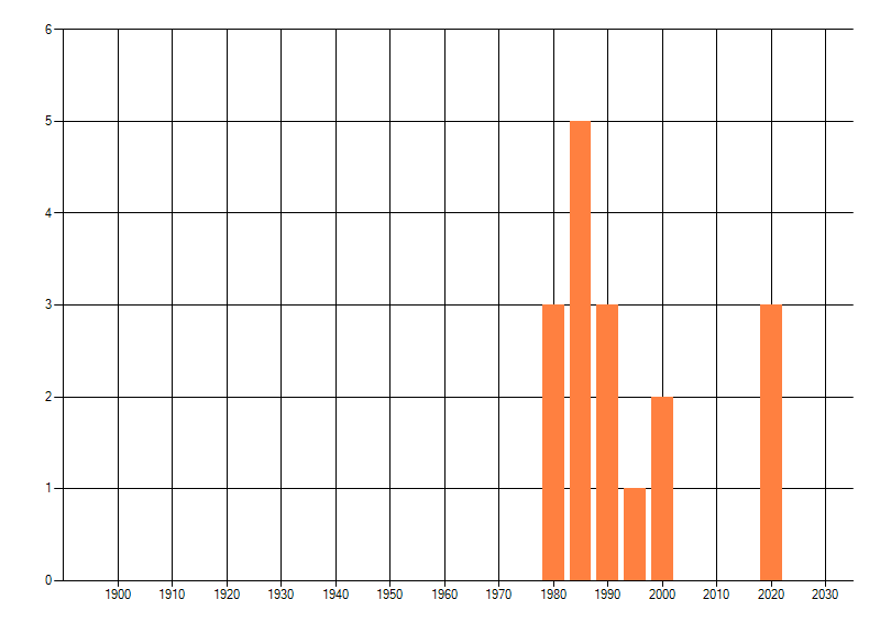 Het aantal atlasblokken (5x5 km) waarin de soort is gemeld binnen een periode van vijf jaar (vanaf 1980) of twintig jaar. Niet gecorrigeerd voor waarnemersinspanning en het aantal doorgegeven waarnemingen kan sterk variëren per periode, dus een trend in verspreiding kan hier niet direct uit worden afgelezen. Het opgegeven jaartal is het eerste jaar van de periode. Bron: gevalideerde waarnemingen uit de NDFF.