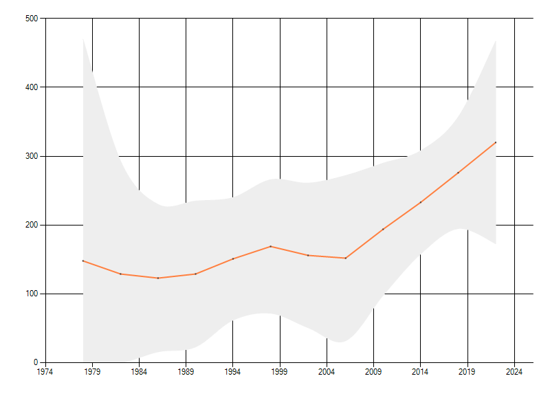 Gemiddelde trend van het aantal kilometerhokken waarin de soort voorkomt, weergegeven als indexcijfer (1975-1978 = 100).