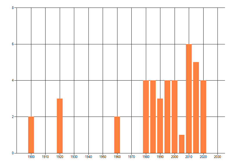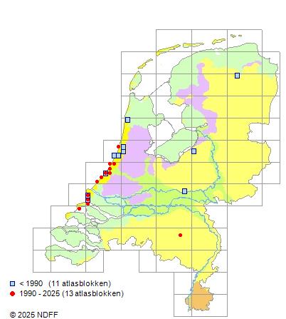 Het aantal atlasblokken (5x5 km) waarin de soort is gemeld binnen een periode van vijf jaar (vanaf 1980) of twintig jaar. Niet gecorrigeerd voor waarnemersinspanning en het aantal doorgegeven waarnemingen kan sterk variëren per periode, dus een trend in verspreiding kan hier niet direct uit worden afgelezen. Het opgegeven jaartal is het eerste jaar van de periode. Bron: gevalideerde waarnemingen uit de NDFF.