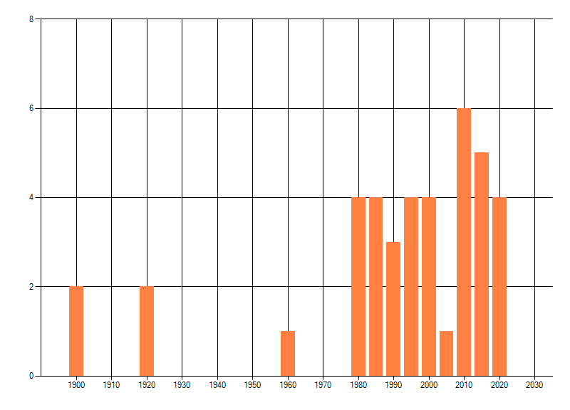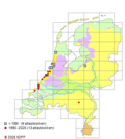 Het aantal atlasblokken (5x5 km) waarin de soort is gemeld binnen een periode van vijf jaar (vanaf 1980) of twintig jaar. Niet gecorrigeerd voor waarnemersinspanning en het aantal doorgegeven waarnemingen kan sterk variëren per periode, dus een trend in verspreiding kan hier niet direct uit worden afgelezen. Het opgegeven jaartal is het eerste jaar van de periode. Bron: gevalideerde waarnemingen uit de NDFF.