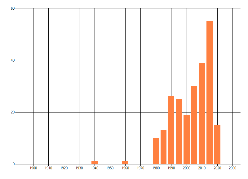 Het aantal atlasblokken (5x5 km) waarin de soort is gemeld binnen een periode van vijf jaar (vanaf 1980) of twintig jaar. Niet gecorrigeerd voor waarnemersinspanning en het aantal doorgegeven waarnemingen kan sterk variëren per periode, dus een trend in verspreiding kan hier niet direct uit worden afgelezen. Het opgegeven jaartal is het eerste jaar van de periode. Bron: gevalideerde waarnemingen uit de NDFF.