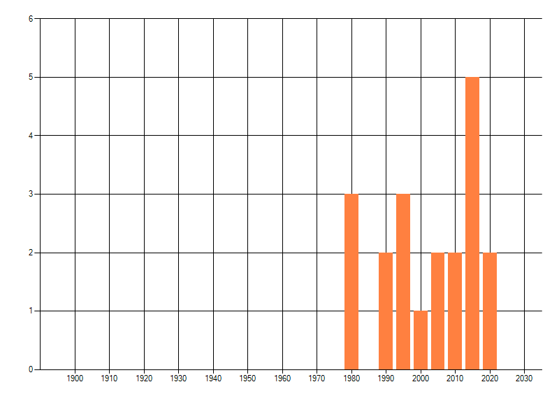 Het aantal atlasblokken (5x5 km) waarin de soort is gemeld binnen een periode van vijf jaar (vanaf 1980) of twintig jaar. Niet gecorrigeerd voor waarnemersinspanning en het aantal doorgegeven waarnemingen kan sterk variëren per periode, dus een trend in verspreiding kan hier niet direct uit worden afgelezen. Het opgegeven jaartal is het eerste jaar van de periode. Bron: gevalideerde waarnemingen uit de NDFF.