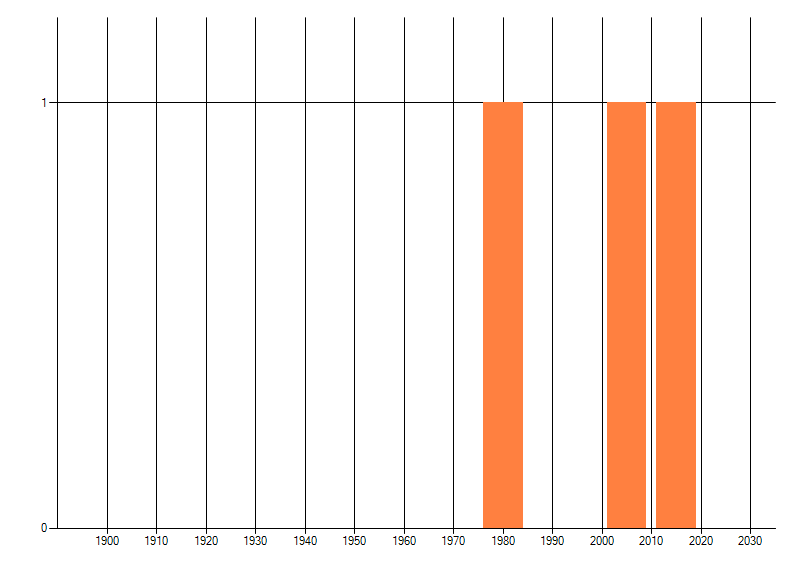 Het aantal atlasblokken (5x5 km) waarin de soort is gemeld binnen een periode van vijf jaar (vanaf 1980) of twintig jaar. Niet gecorrigeerd voor waarnemersinspanning en het aantal doorgegeven waarnemingen kan sterk variëren per periode, dus een trend in verspreiding kan hier niet direct uit worden afgelezen. Het opgegeven jaartal is het eerste jaar van de periode. Bron: gevalideerde waarnemingen uit de NDFF.