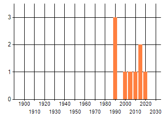 Het aantal atlasblokken (5x5 km) waarin de soort is gemeld binnen een periode van vijf jaar (vanaf 1980) of twintig jaar. Niet gecorrigeerd voor waarnemersinspanning en het aantal doorgegeven waarnemingen kan sterk variëren per periode, dus een trend in verspreiding kan hier niet direct uit worden afgelezen. Het opgegeven jaartal is het eerste jaar van de periode. Bron: gevalideerde waarnemingen uit de NDFF.