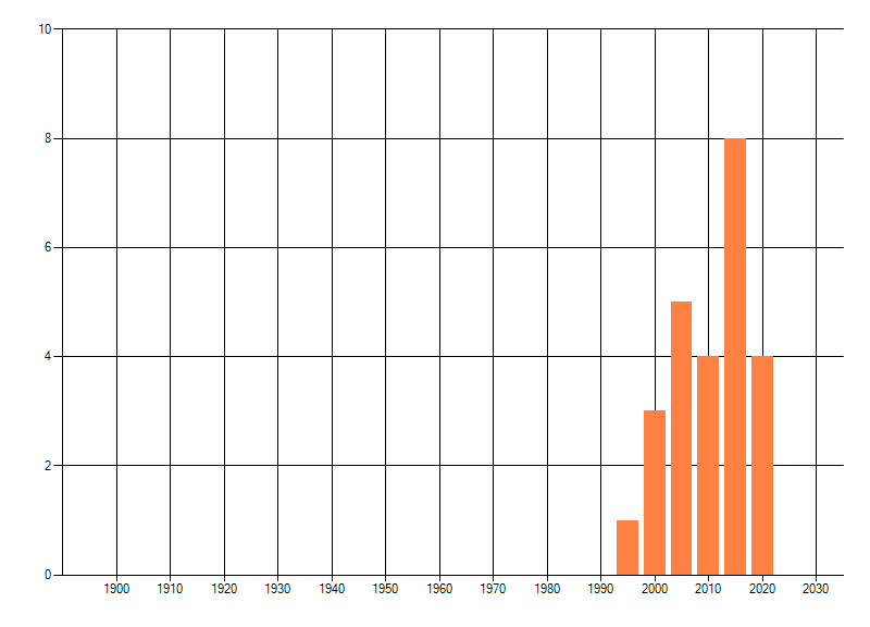 Het aantal atlasblokken (5x5 km) waarin de soort is gemeld binnen een periode van vijf jaar (vanaf 1980) of twintig jaar. Niet gecorrigeerd voor waarnemersinspanning en het aantal doorgegeven waarnemingen kan sterk variëren per periode, dus een trend in verspreiding kan hier niet direct uit worden afgelezen. Het opgegeven jaartal is het eerste jaar van de periode. Bron: gevalideerde waarnemingen uit de NDFF.