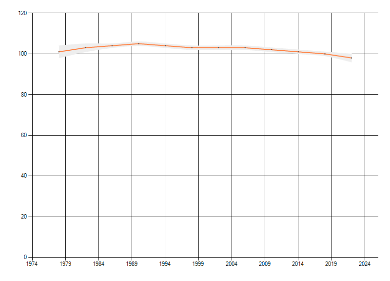 Gemiddelde trend van het aantal kilometerhokken waarin de soort voorkomt, weergegeven als indexcijfer (1975-1978 = 100). De trend is gecorrigeerd voor waarnemersinspanning en geeft de relatieve verandering in het aantal bezette kilometerhokken weer. Voor de berekening worden de data per periode van vier jaar samengenomen. In de grafiek correspondeert ieder punt met het laatste jaar van zo'n periode.